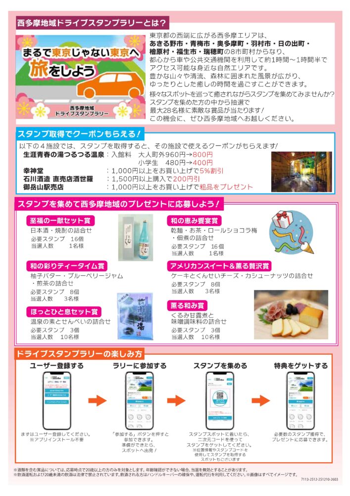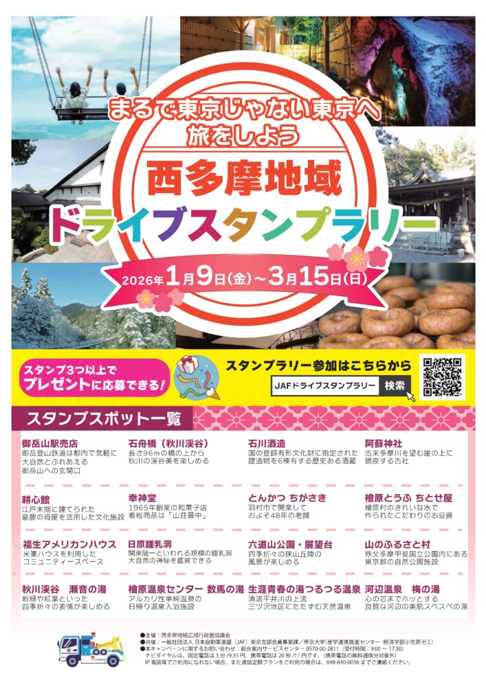 西多摩地域広域行政圏協議会は一般社団法人 日本自動車連盟(JAF)東京支部および帝京大学と連携し、「まるで東京じゃない東京へ旅をしよう 西多摩地域ドライブスタンプラリー」(開催期間:2026年1月9日(金)~2026年3月15日(日))を、開催いたします。ぜひご参加ください。